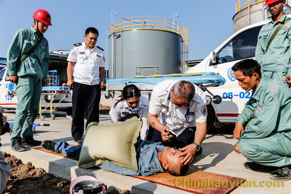 演練假想昊源公司園區正在建設的年產6000噸二甘醇胺項目配套罐區,某防腐公司4名員工對在建二甘醇胺儲罐內部進行防腐受限空間作業,因天氣炎熱,通風不良,2名工人在罐內工作時先后暈倒,外面監護的1名工人呼叫沒有反應,隨即進入罐內施救,罐外還留一名工人監護。進入罐內救援的工人告訴外面監護人員,罐內悶熱,呼吸困難,正準備將2名工人移出罐外,但是在移動罐內人員時感覺乏力,無法移動,施救人員也暈倒在罐內。罐外監護的工人趕緊尋求幫助,正好遇見路過此處巡檢的操作人員,操作人員迅速了解情況,緊急將情況匯報公司領導。公司領導立即組織人員自救,聯系120急救中心人員救援,并逐級向市應急局、市政府匯報事故情況。