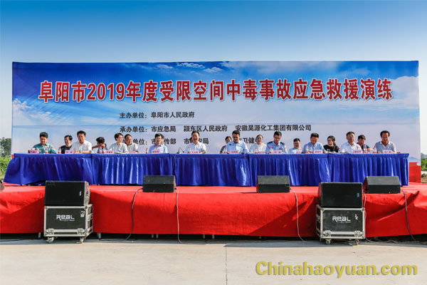 7月5日下午,阜陽市2019年度受限空間中毒事故應急救援演練在昊源公司阜陽煤基新材料產業園區舉行。市委常委、副市長王玉峰,市應急管理局長江利國,潁東區委常委、常務副區長顧中偉,市公安局副局長萬傳紅、市應急局管理局副局長劉琮,市委宣傳部(市政府新聞辦)副主任李雅伶、潁東區應急管理局長高文沖,安徽昊源化工集團有限公司黨委書記、董事長凡殿才,市120急救中心副主任田光宇、安徽新藍天安全技術服務有限公司總經理張廣明出席活動,并觀摩演練。