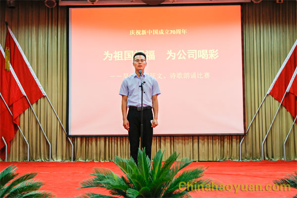 為慶祝新中國成立70周年,弘揚(yáng)愛國主義精神,爭做時代先鋒,表達(dá)愛國、愛黨、愛昊源的真摯感情, 凝聚公司建設(shè)“百億規(guī)模、百年昊源”的精神動力,展現(xiàn)新時代工人良好形象,9月30日,由公司工會、團(tuán)委舉辦的“慶祝建國七十周年,為祖國祝福、為公司喝彩”昊源集團(tuán)演講、朗誦比賽在公司大禮堂拉開帷幕。
