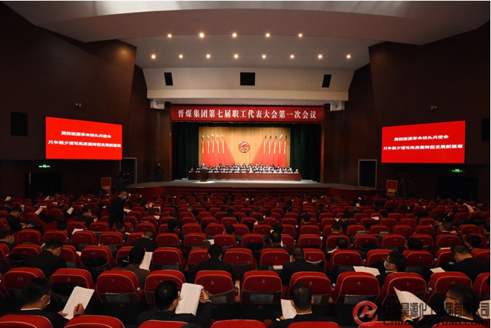 晉煤集團(tuán)七屆一次職代會(huì)會(huì)場(chǎng)內(nèi),主席臺(tái)后幕正中由晉煤標(biāo)志“JM”縮寫(xiě)組合而成的企徽,在分列兩側(cè)的10面鮮艷紅旗映襯下熠熠生輝。二樓眺臺(tái)上懸掛著“勇?lián)茉锤锩蓬^兵使命 只爭(zhēng)朝夕譜寫(xiě)高質(zhì)量轉(zhuǎn)型發(fā)展新篇章”的橫幅。整個(gè)會(huì)場(chǎng)氣氛莊嚴(yán)熱烈。