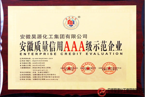 安徽省徽企質量信用評價中心和安徽企業信用等級評價專家委員會依據GB/T23794-2015《企業信用評價指標》、Q/AH/HQXY001-2019《企業信用等級評價管理辦法》,針對昊源公司的信用記錄、經營狀況、財務指標、發展前景,結合國家及地方相關政策,本著公平、公正、獨立、客觀、科學原則,評定安徽昊源化工集團有限公司企業信用等級為:安徽質量信用AAA級示范企業。并為公司頒發了牌匾及證書。