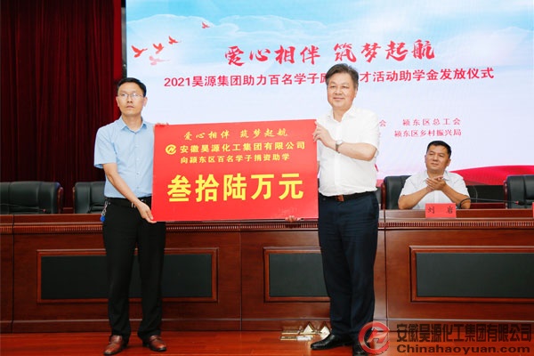 隨后,安徽昊源化工集團(tuán)有限公司向潁東區(qū)政府捐贈36萬元,用于設(shè)立勵志助學(xué)金,幫助勵志學(xué)子順利走進(jìn)大學(xué)、繼續(xù)深造,用知識改變自己的命運。