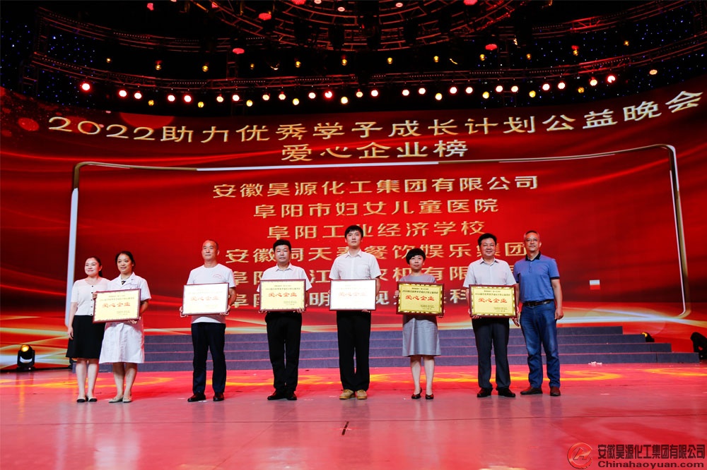 8月14日,阜陽廣播電視臺舉行了 “2022助力優秀學子成長計劃公益晚會”,昊源公司黨委副書記、副總經理高玉磊代表安徽昊源化工集團有限公司出席活動。會上,安徽昊源化工集團有限公司被授予“愛心企業”榮譽稱號,高玉磊作為企業代表為優秀學生頒發勵志助學金。