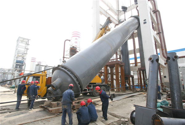 2009年3月16日上午9點(diǎn)30分,在陣陣鞭炮聲中,化機(jī)公司兩臺(tái)20T主卷揚(yáng)機(jī)隆隆響起,使自重達(dá)280T的直徑2000合成塔緩緩上升。中午11時(shí)30分,緊張地吊裝工作順利完成。