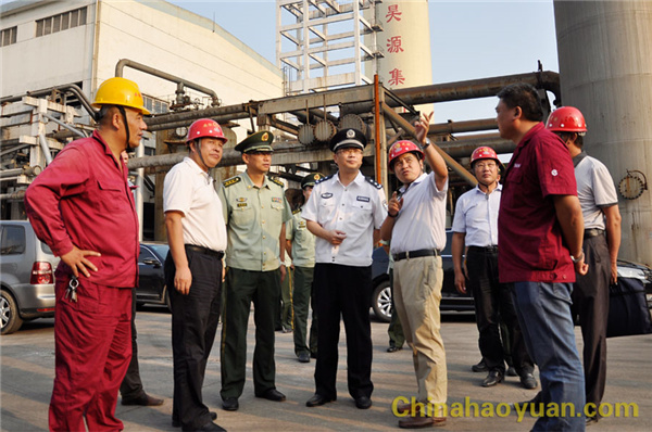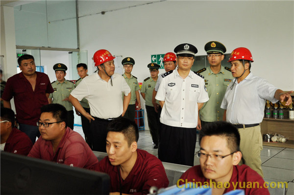 8月13日下午,市委常委、政法委書記、阜陽市公安局長劉立兵、阜陽市安監局局長李哲、市消防支隊支隊長孟向東一行數十人蒞臨昊源公司檢查指導安全工作。公司常務副總經理凡殿才、副總經理張海生、高明林及安全科相關負責人陪同檢查。