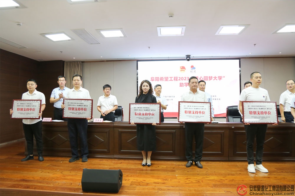 9月1日上午,阜陽市希望工程2023“愛心圓夢大學”獎牌發放儀式在市政府會議室舉行,昊源公司被授予“愛心圓夢大學特別支持單位”稱號,公司團委書記朱梅代表公司領取獎牌。