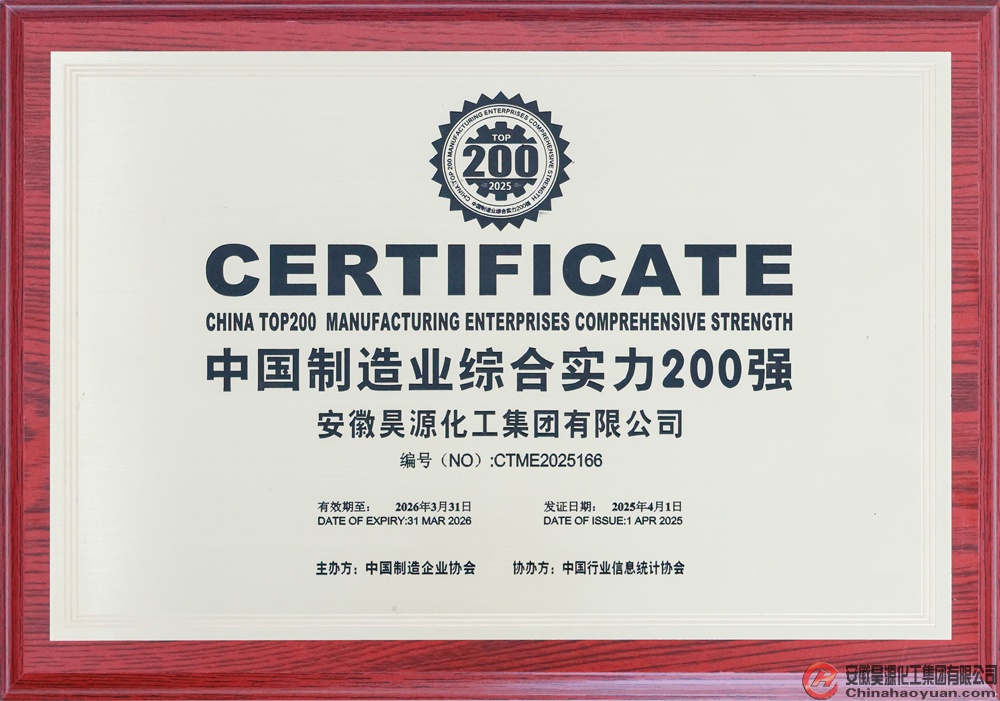 近期,安徽昊源化工集團有限公司憑借其強大的技術創新能力、穩健的經營管理策略、卓越的產品質量以及顯著的市場影響力,被中國制造企業協會、中國行業信息統計協會及中國制造企業網評測為“2025年中國制造業綜合實力200強”,位列第166位。