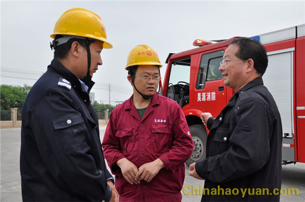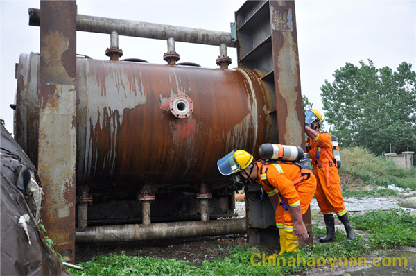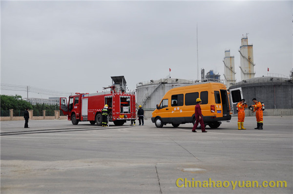 演練由公司安全副總工劉升指揮,保衛處處長蔣春生負責演練協調。劉升向消防隊員發出火災救援指令后,不到五分鐘,消防車、氣防車就拉著警笛呼嘯而來,停到著火點的上風口。消防隊員一方面查看火情、火勢,一方面組裝消防器具,進行即時救援。很快火勢得到控制,并隨后撲滅。這時早已穿好防化服和配戴好空氣呼吸器的防化人員,立即沖入事故現場,進行仔細排查現場情況、搜救事故現場人員。在反復排查,確定著火已徹底撲滅,現場無人員傷亡后,防化人員退出事故現場,演練結束。