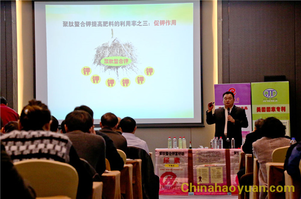 北京巨泰科技有限公司董事長魏安興向參會經銷商分析了聚肽螯合鉀富鋅硼尿素產品機理報告。