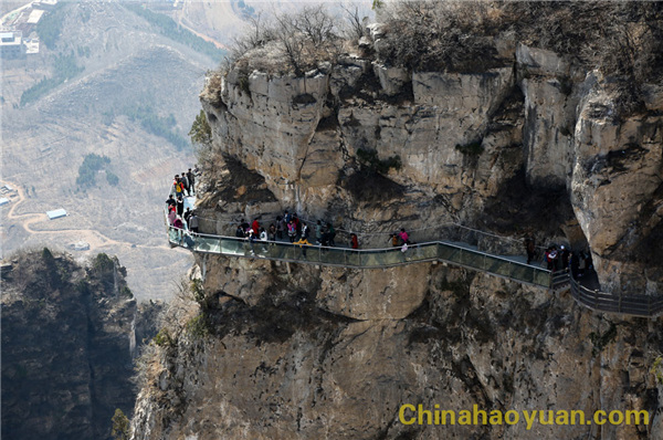 云臺山紅石峽谷長約350米,東西對峙,紅色的石層與綠寶石色的泉水相互輝映,創作出一幅幅美麗的圖畫!大家在感嘆著大自然神奇的同時,也挑戰了最具刺激驚險的玻璃棧道,大家手牽著手、肩并著肩小心翼翼地登上玻璃棧道,欣賞雄偉壯觀的奇峰俊嶺,方知“會當凌絕頂,一覽眾山小”,心情激動無比!
