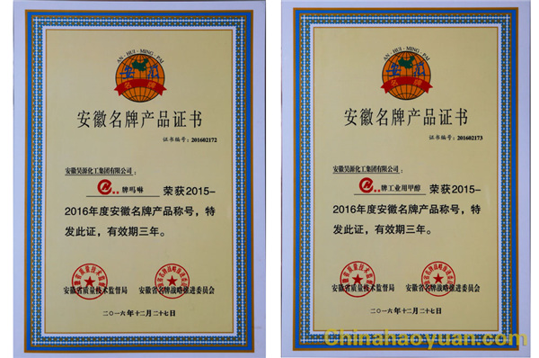 公司產(chǎn)品“昊源牌”甲醇、“昊源牌”嗎啉,經(jīng)安徽省質(zhì)量技術(shù)監(jiān)督局、安徽省名牌戰(zhàn)略推進(jìn)委員會審定,榮獲2015至2016年度安徽省名牌產(chǎn)品稱號。