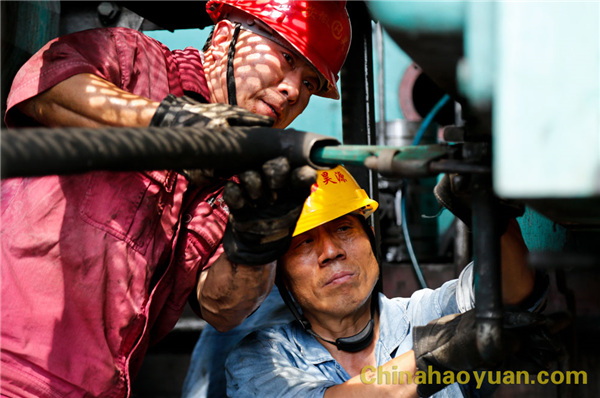 操作人員巡檢在炙熱的設備塔群中,雖然身上被烤得火辣辣的,但他們依然認真檢查著每一個控制點、每一臺機泵,測量著機泵溫度和振動,確保設備在高溫下健康、穩定運行。