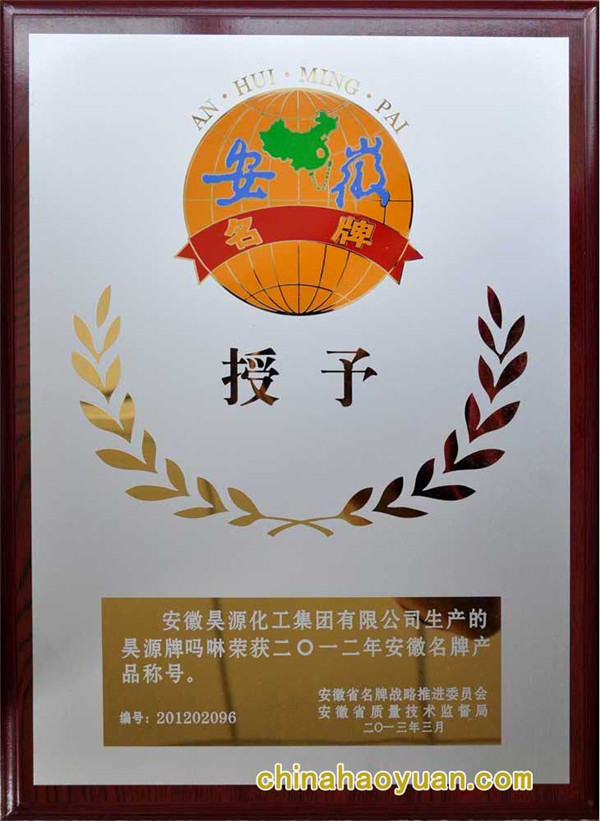 為大力宣傳安徽名牌,引導企業樹立名牌意識,進一步推進全省名牌發展戰略的實施,省質量技術監督局將對獲得2012年安徽名牌稱號和通過名牌復審的企業予以表彰,公司“昊源牌嗎啉”位于2012年復審通過的安徽名牌企業名單之列。