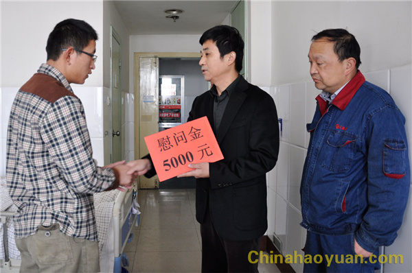 公司領導得知這個消息后,對劉沙沙一家人的生活十分牽掛。11月16日上午,工會副主席戚偉、楊波及尿素車間主任陳飛等一行代表公司來到阜陽市第二人民醫院探望劉沙沙的父親,并送去5000元慰問金。