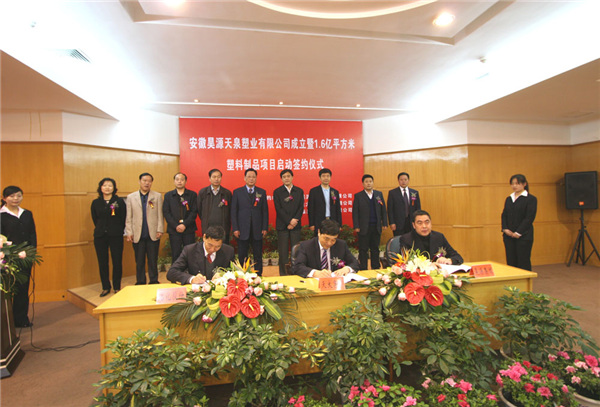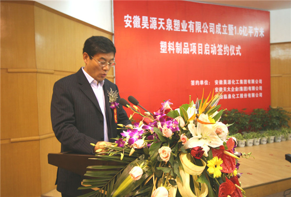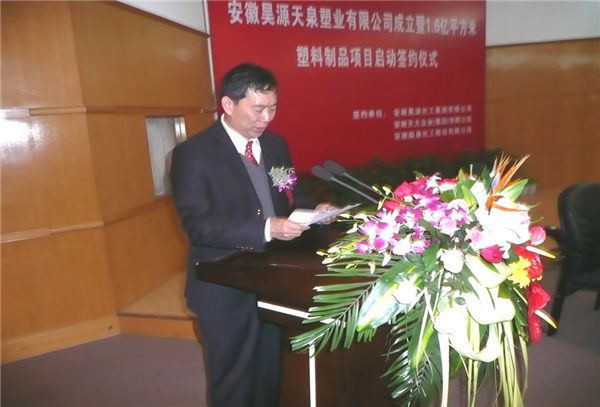 2008年4月22日上午9時(shí)18分,在阜陽(yáng)市政府三樓一號(hào)會(huì)議室,隆重舉行安徽天大企業(yè)(集團(tuán))有限公司、安徽臨泉化工股份有限公司、安徽昊源化工集團(tuán)有限公司合作成立安徽昊源天泉塑業(yè)有限公司簽約儀式暨建設(shè)1.6億平方米塑料制品生產(chǎn)線啟動(dòng)儀式。