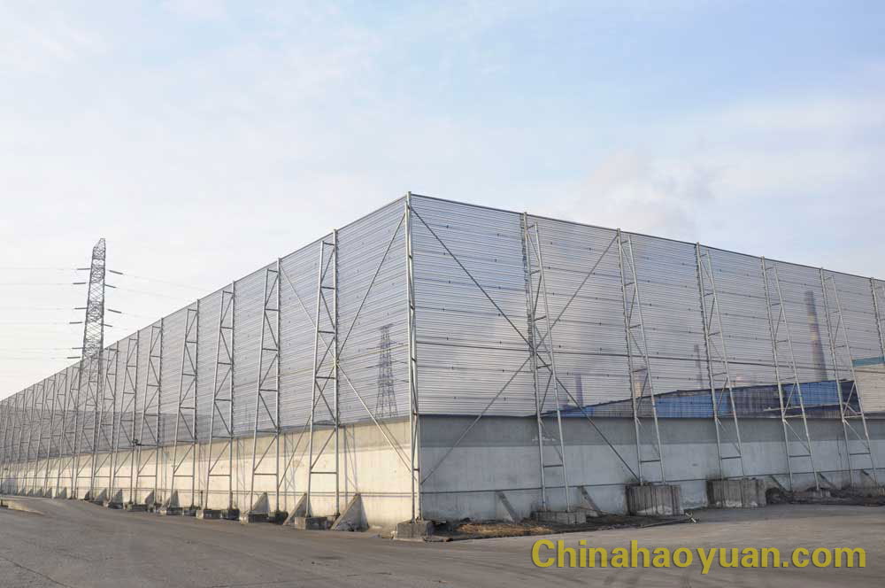 在煤場、渣場地、東廠界(共7處)周圍建設防風抑塵網:總長度2600米,高10米,總面積約21000平方米,總投資268萬元。該工程于2014年3月開工建設,2015年2月建成投用。防風抑塵網擋風板采用新型三峰防風抑塵網板,其原理是是利用空氣動力學原理,按照現場環境加工成一定幾何形的擋風板,并根據現場條件將擋風板組合成擋風抑塵墻,使流通的空氣(強風) 從外通過墻體時,在墻體內測形成上、下干擾的氣流,已達到外側強風,內側弱風,外側小風,內側無風的效果,從而防止粉塵的飛揚,達到抑塵的效果。新設置的擋風抑塵墻可有效降低來流風的風速,改變一部分來流風通過擋風抑塵墻后的風向,最大限度地損失來流風的動能,避免來流風的明顯渦流,減少風的湍流度而達到減少起塵的目的。綜合抑塵率>85%,完全滿足環保要求。